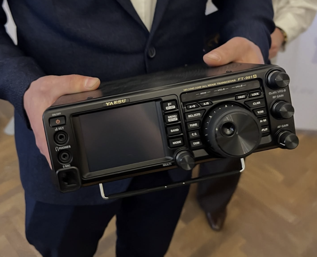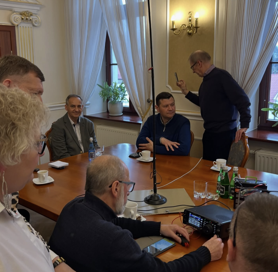Podczas wizyty otrzymaliśmy nową radiostację, która na pewno szybko trafi do pracy na pasmach. Co więcej — sprzęt został od razu podłączony i jeszcze z sali urzędu udało się zrobić łączność z Ukrainą